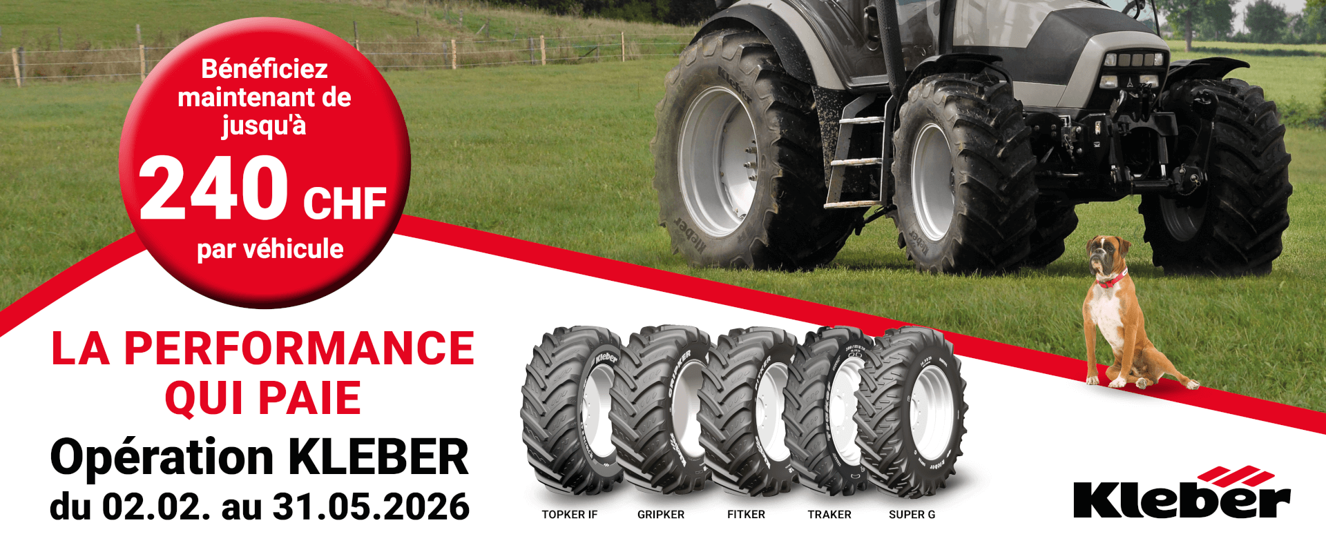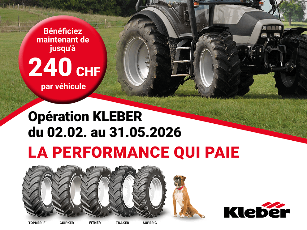 Pour participer à l'action, achetez pendant la période de l'action, chez votre revendeur de pneus de votre choix au moins deux pneus KLEBER Pneus agricoles à partir de 20 pouces.